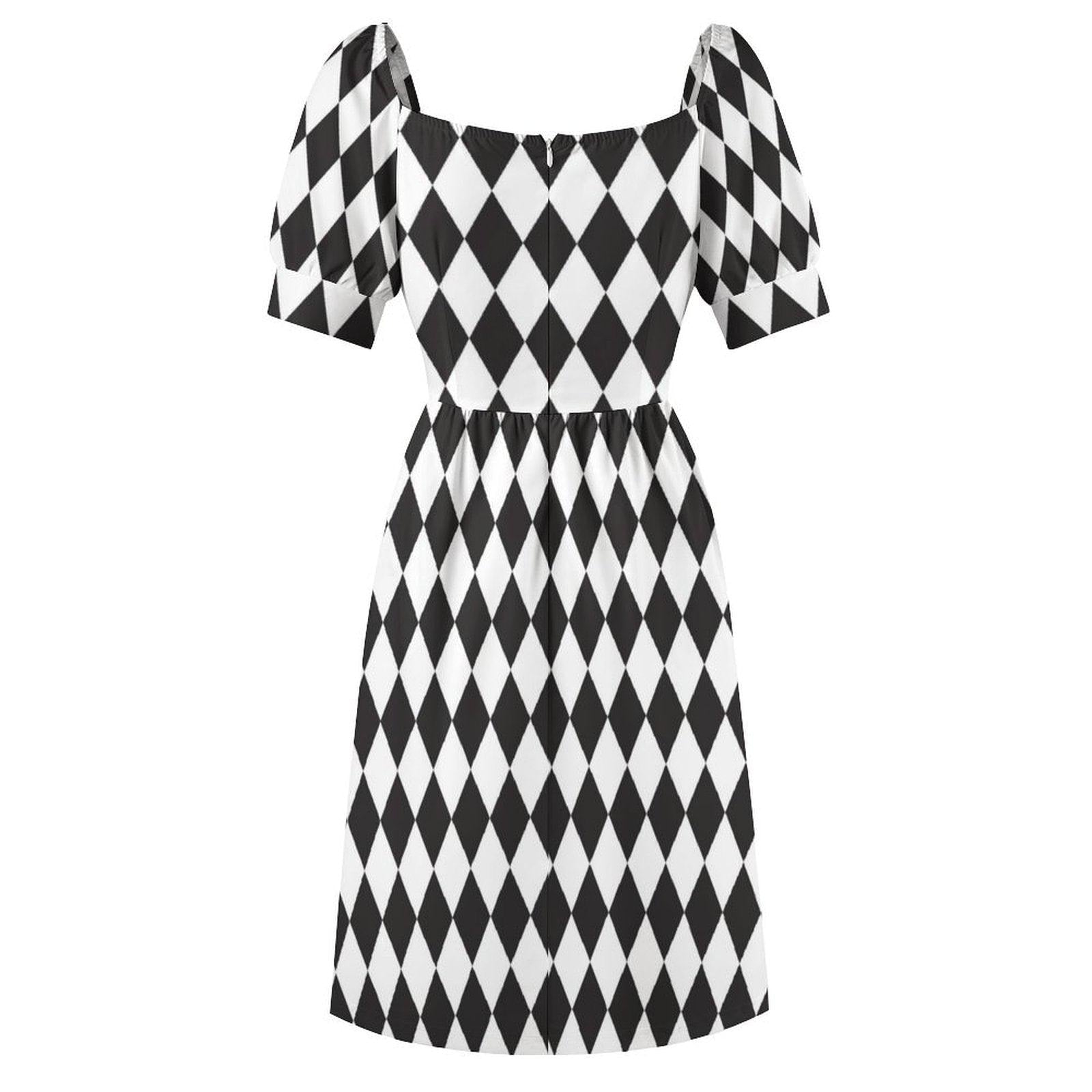 Black and white harlequin dress, gothic Alice puff sleeve dress, checkered fairytale party outfit, sweetheart neckline mini dress, fantasy
