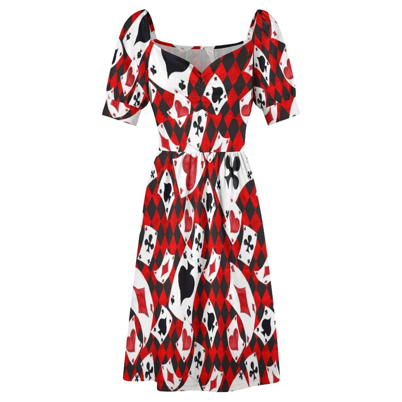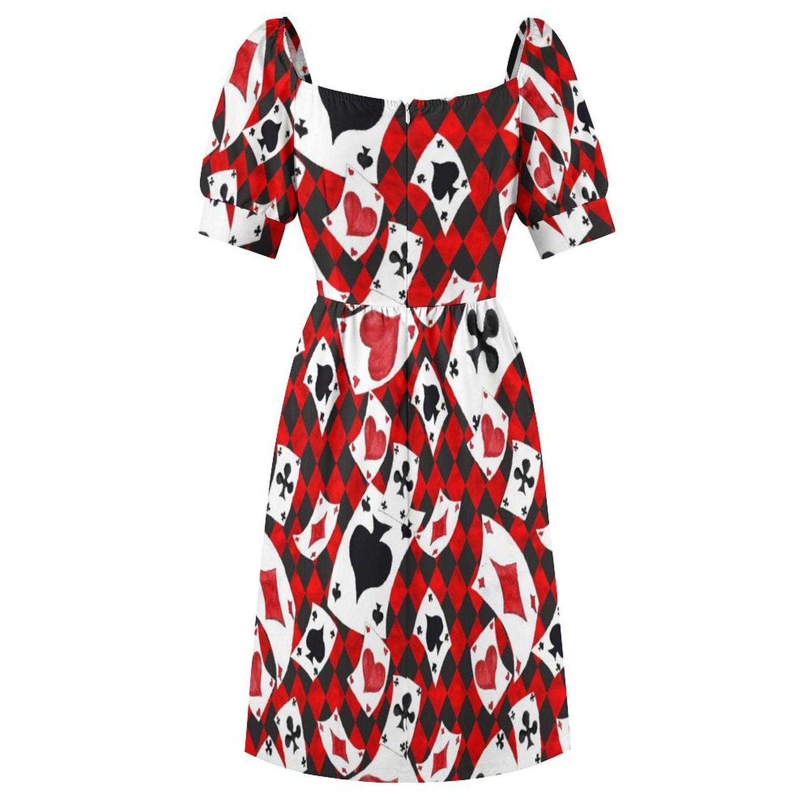Step into Wonderland with this playing card puff sleeve dress, perfect for themed parties, fantasy events, or cosplay. The sweetheart neckline and whimsical red print bring a touch of storybook magic to any outfit - ideal for anyone who loves Alice-inspired fashion with a cottagecore twist ♠️♥️