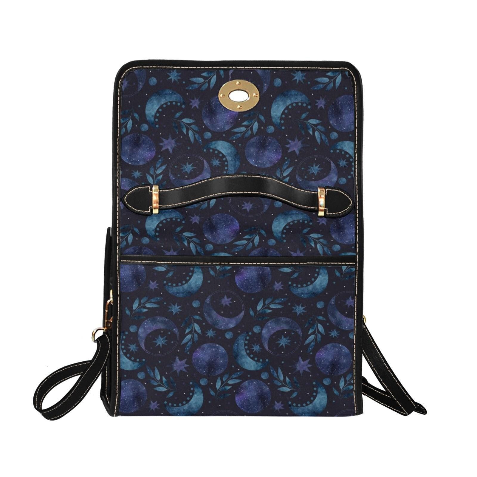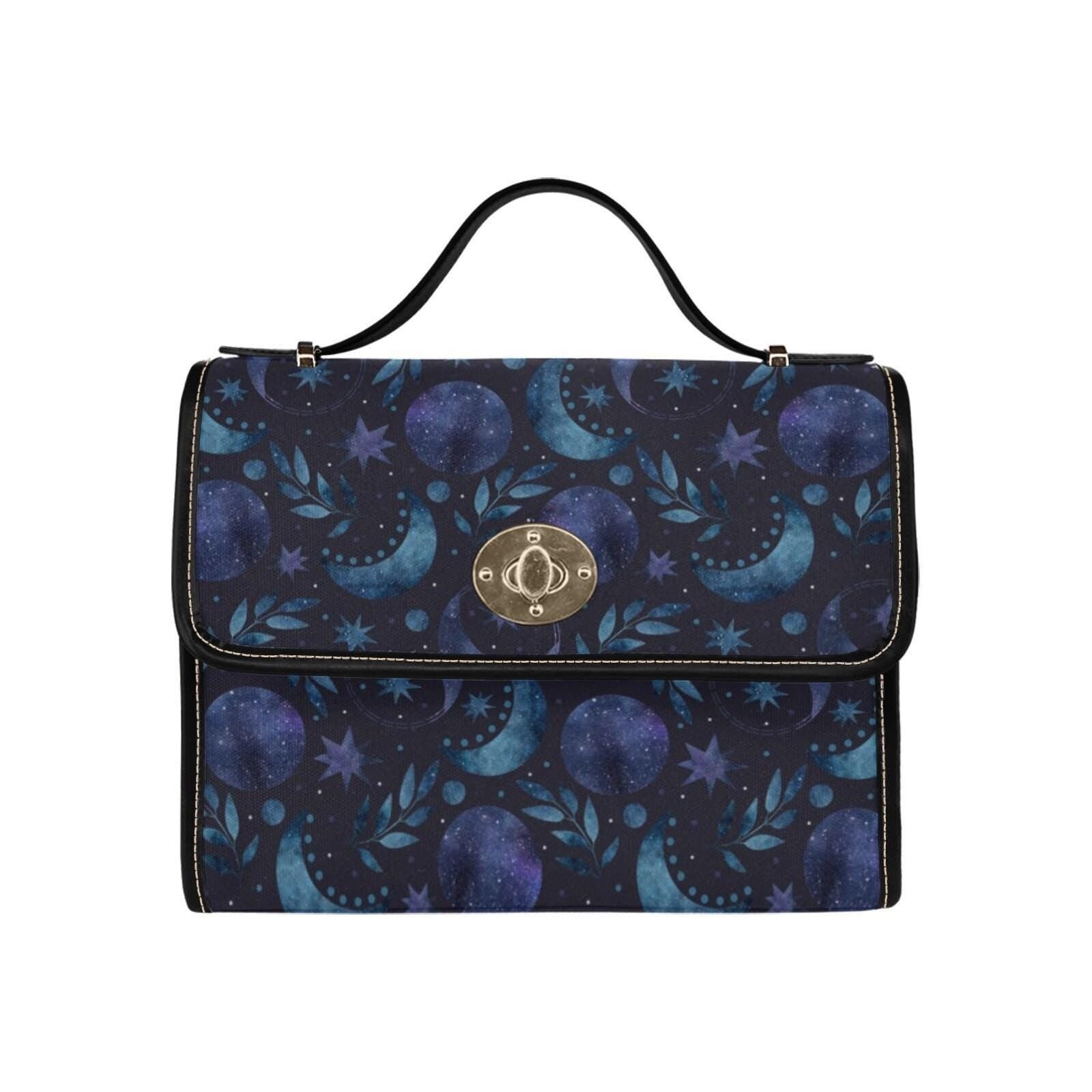 moon print purse, witchy vibe bag, celestial shoulder bag, galaxy print tote, lunar moon handbag, stars and moons bag, cosmic aesthetic purse, stargazer gift idea, astrology purse gift, dreamy night sky bag, witchcore fashion bag, dark blue satchel, magic themed purse