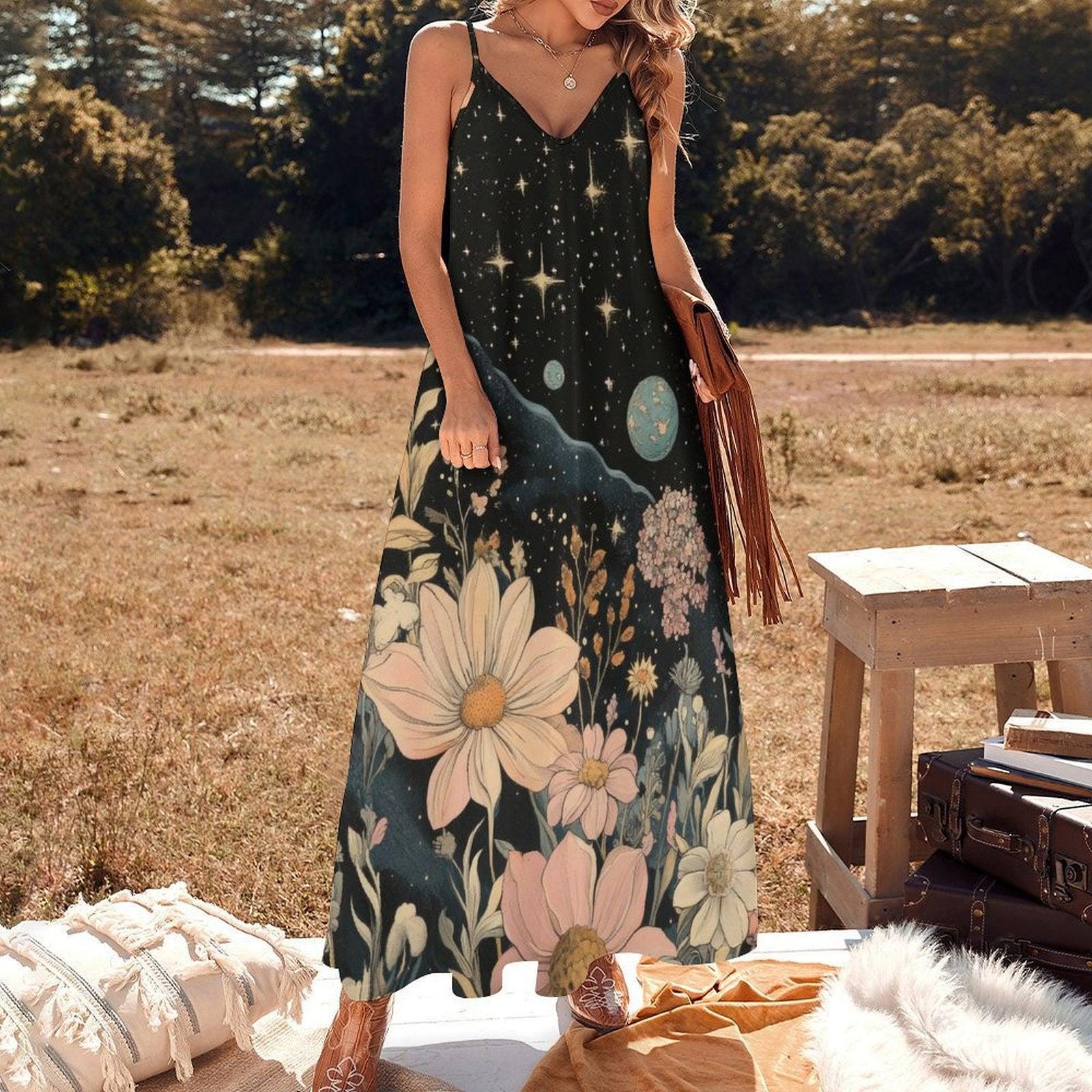 cosmic floral dress, galaxy garden look, witchcore sundress, boho moon outfit, moon flower print, starry sky dress, celestial maxi gown, pastel moon dress, dreamy boho look, moonlight cottage, lunar flower print, space floral vibe, star dress women