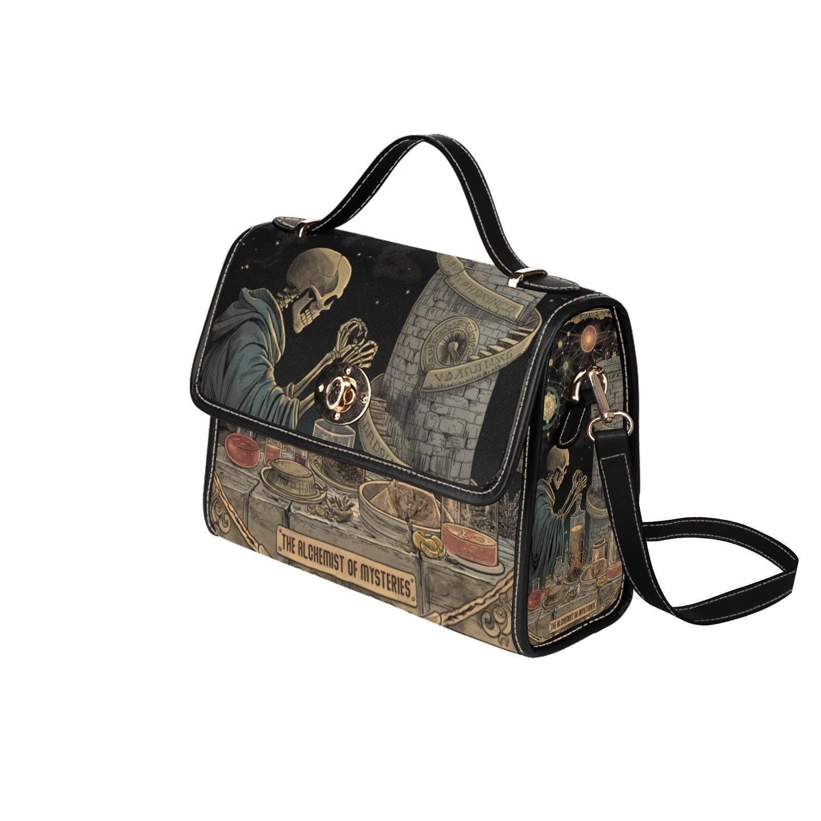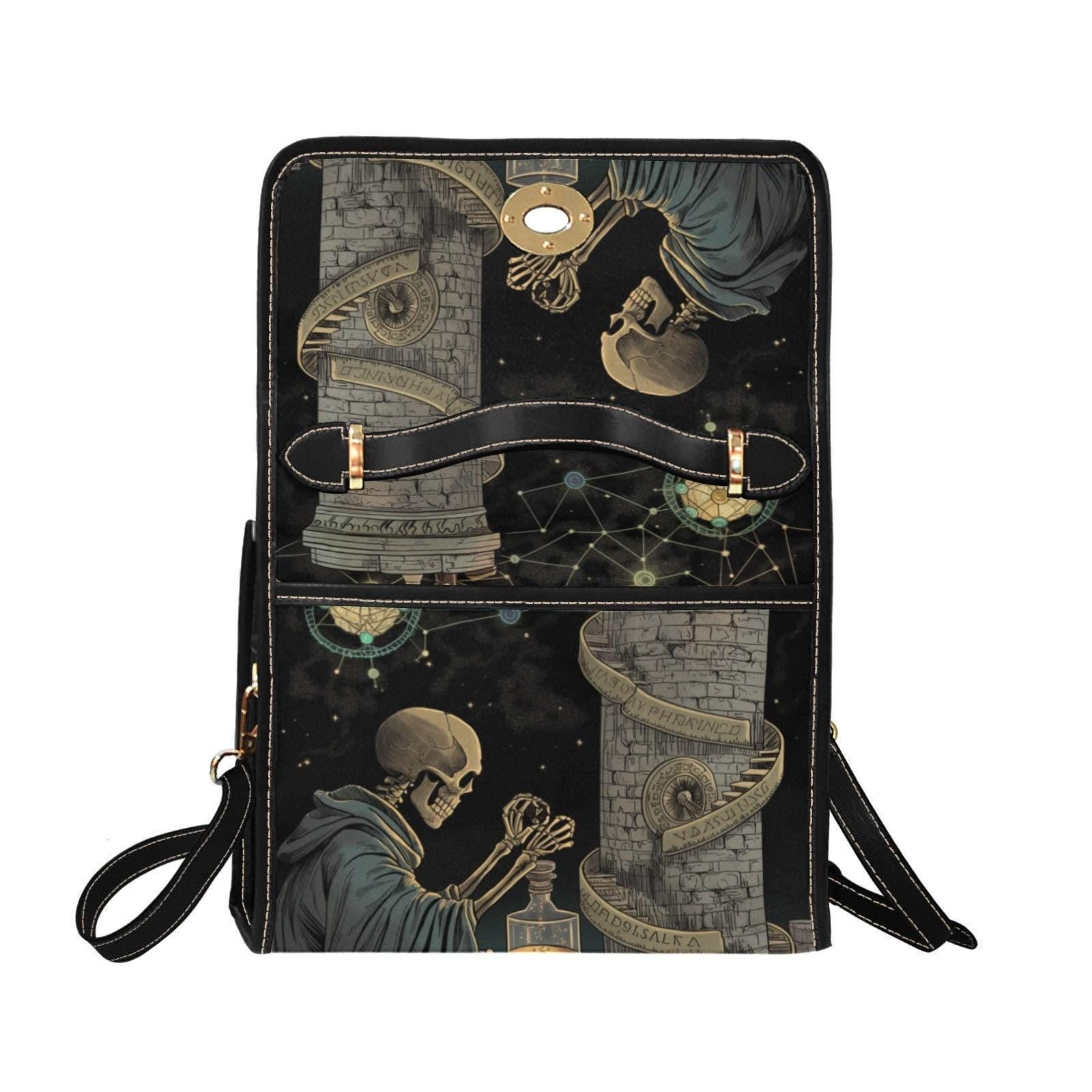 Dark academia skeleton bag, alchemist aesthetic canvas purse, occult goth crossbody satchel, mystical witch scholar gift idea