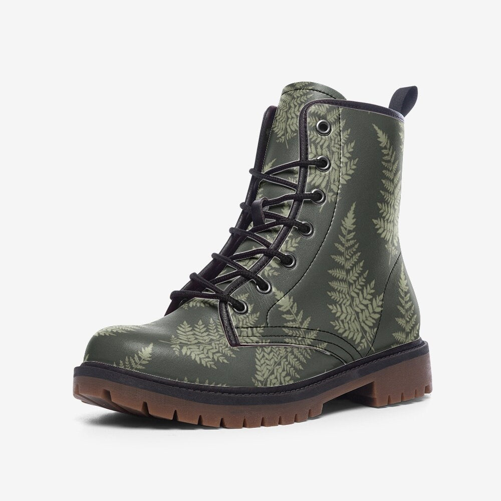 Fern print combat boots, botanical nature lace up shoes, woodland plant ankle boots, forest leaf pattern footwear, rustic walking boots