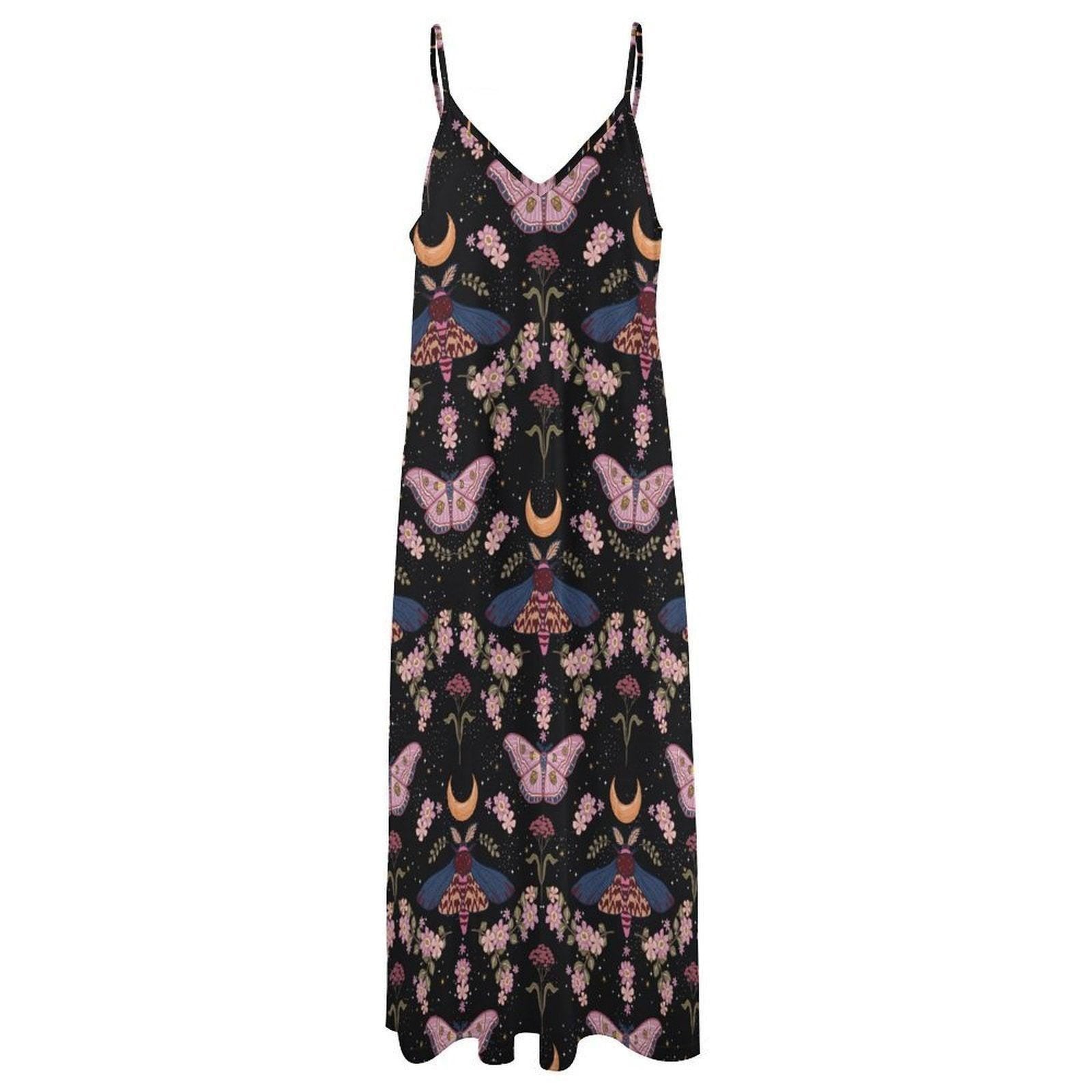 Moon moth floral dress, Witchcore butterfly summer gown, Crescent moon boho sundress, Fairy goth garden outfit, Celestial black maxi look