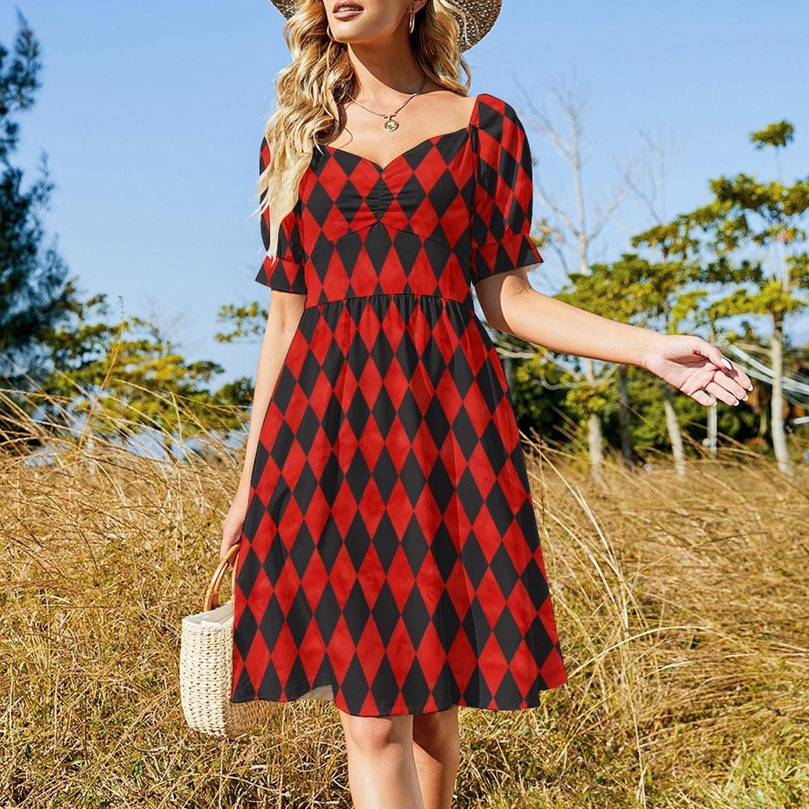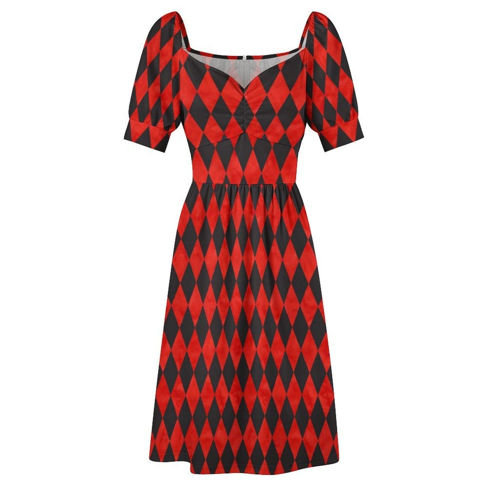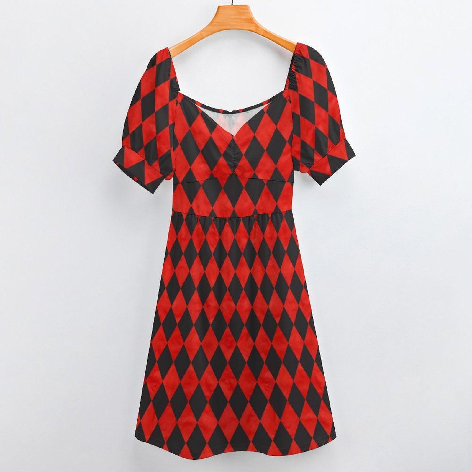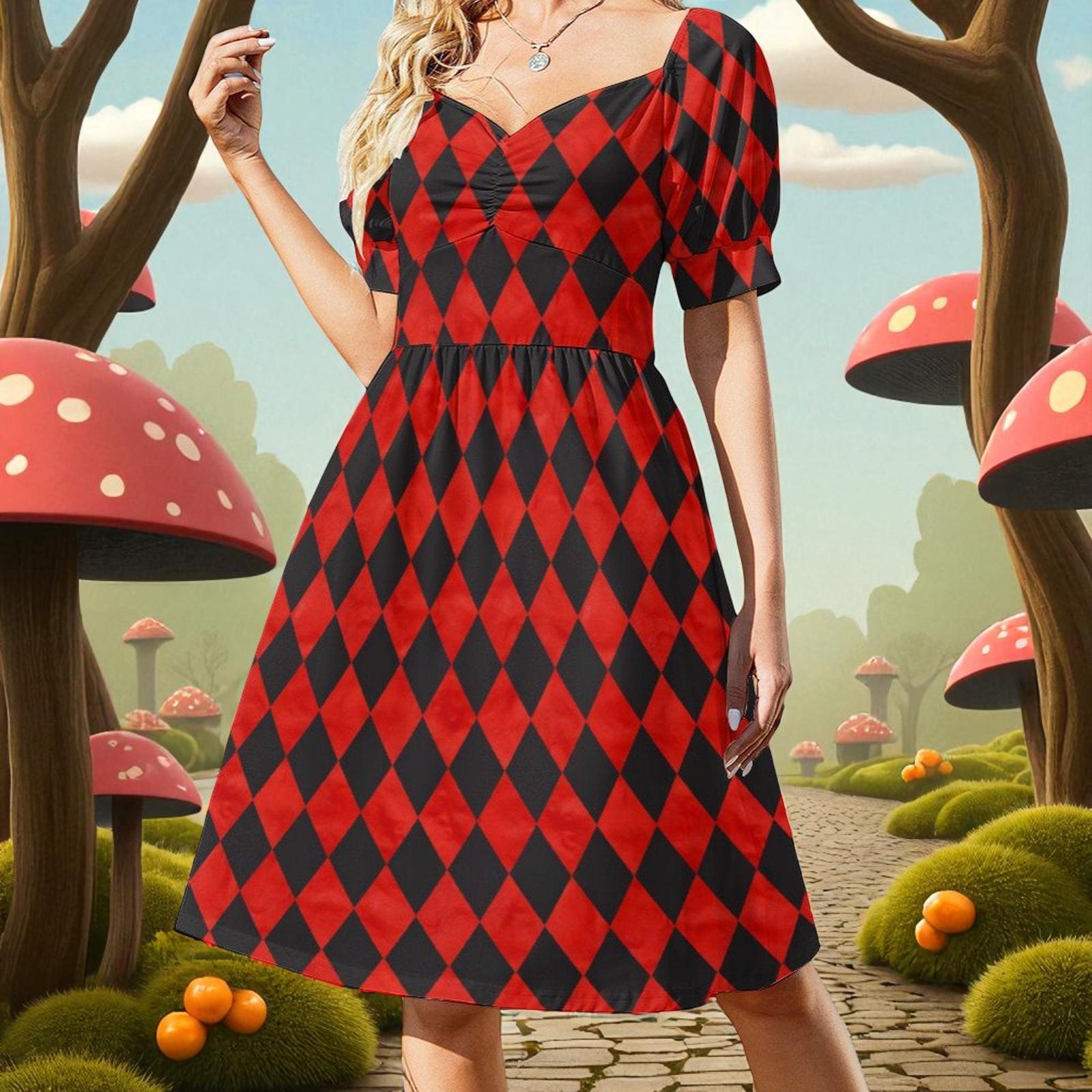 Make a bold entrance in this red harlequin puff sleeve dress, perfect for Wonderland costumes, gothic carnivals, or fantasy-themed events. With its checkered print and flirty silhouette, this dress channels playful mischief with a fairytale edge — ideal for cosplay or statement style 🃏