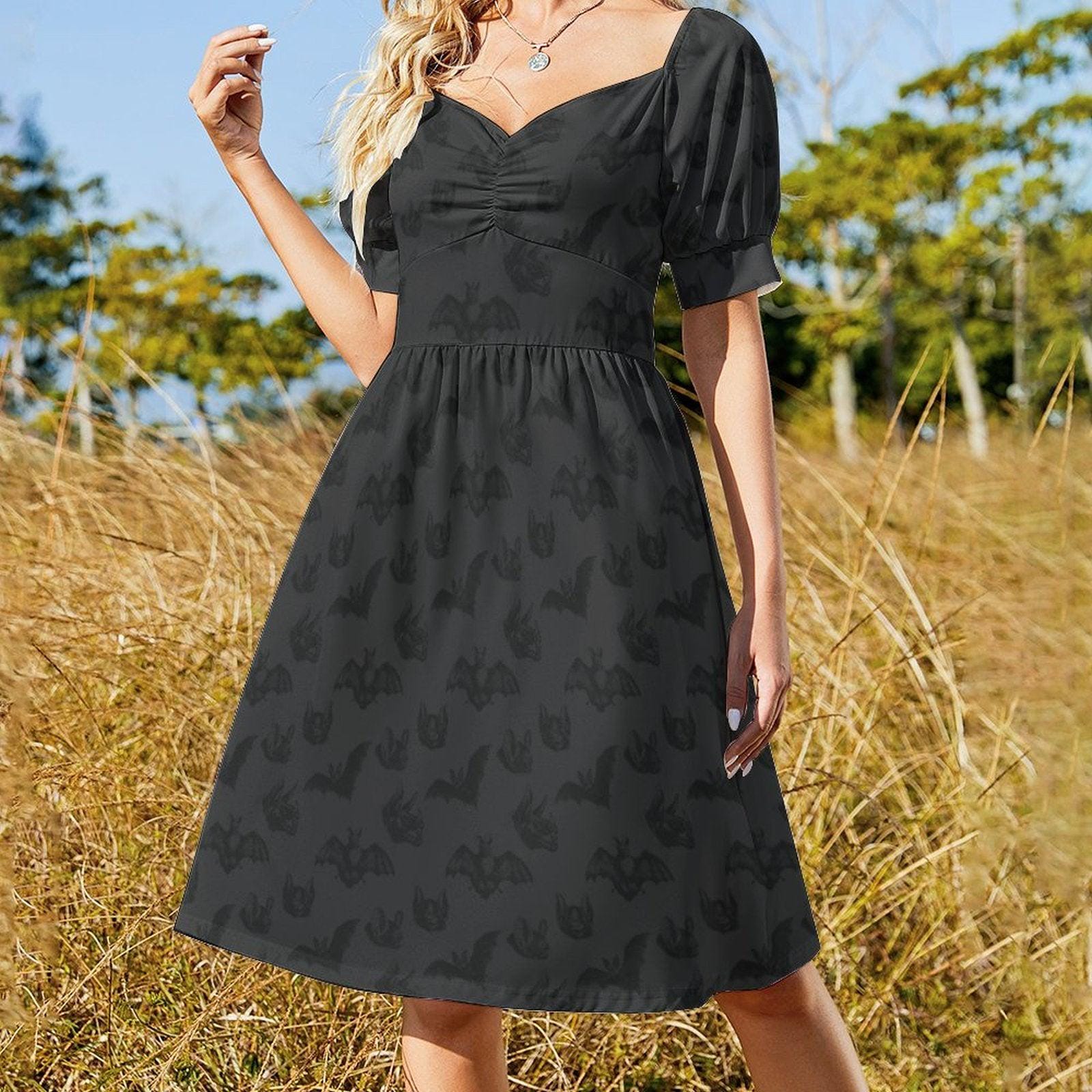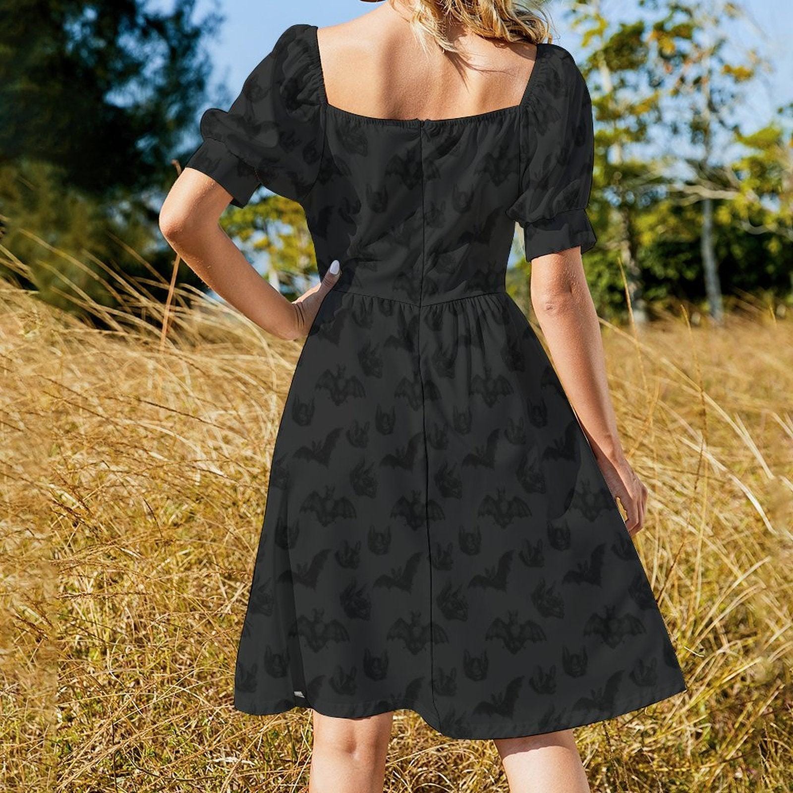 bat print dress, Halloween puff sleeve, spooky goth dress, dark fairycore bat, witchy bat outfit, gothic summer fit, spooky picnic dress, bat lover clothing, goth Halloween dress, bats moon dress, alt bat fashion, witchy alt vibes, spooky sundress